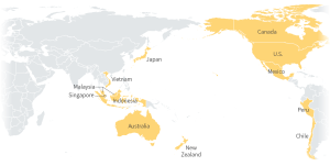 En el TPP participan 12 países de la cuenca del Pacífico incluyendo a EE.UU. pero excluyendo a China (véase mapa adjunto). El TPP ya ha sido firmado, pero está pendiente de ratificación de los países miembros. El Presidente Trump firmó la orden ejecutiva el pasado 23 de enero para iniciar el proceso legal de salida de este ALC.